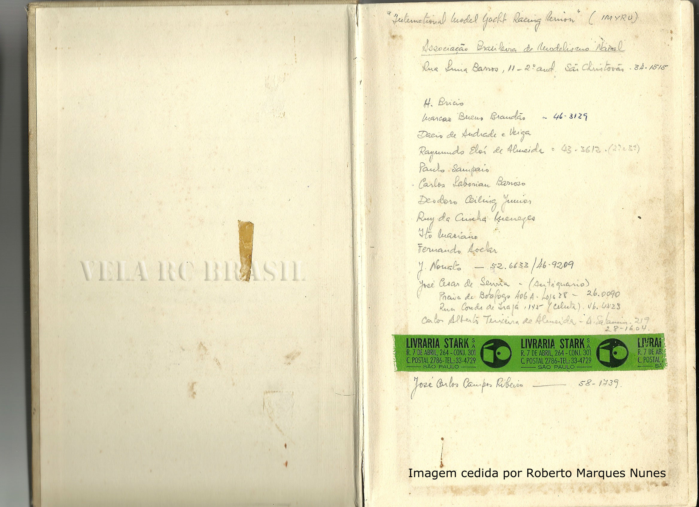 No corpo do documento aparece nomes dos modelistas navais da época, entre eles dois nomes se destacam: Hely Brício (H. Brício) projetista, construtor e velejador, considerado por muitos o pai do modelismo naval no Brasil; José Nonato (J. Nonato) o meu “guru” no modelismo naval, foi o responsável pela iniciação na vela de leme de vento, com ele aprendi regulagem do mastro, da buja, da mestra e do sistema de leme de vento e principalmente teorias de projetos e construção. O sonho de após 17 anos!!! Era o ano 1970, até então os veleiros eram guiados por um sistema de controle chamado “leme de vento”. Em meados deste mesmo ano sugiram os primeiros veleiros rádio controle. Passaram-se alguns anos, e em 1982 no Campeonato Mundial da Classe M – Marblehead em Dunquerque na França a IMYRU passou a adotar as regras de regatas (IYRR) da IYRU International Yacht Racing Union. Neste mesmo ano a UBVRC – União Brasileira de Veleiros Rádio Controlado filia-se a IMYRU enviando os primeiros representantes a este mundial.