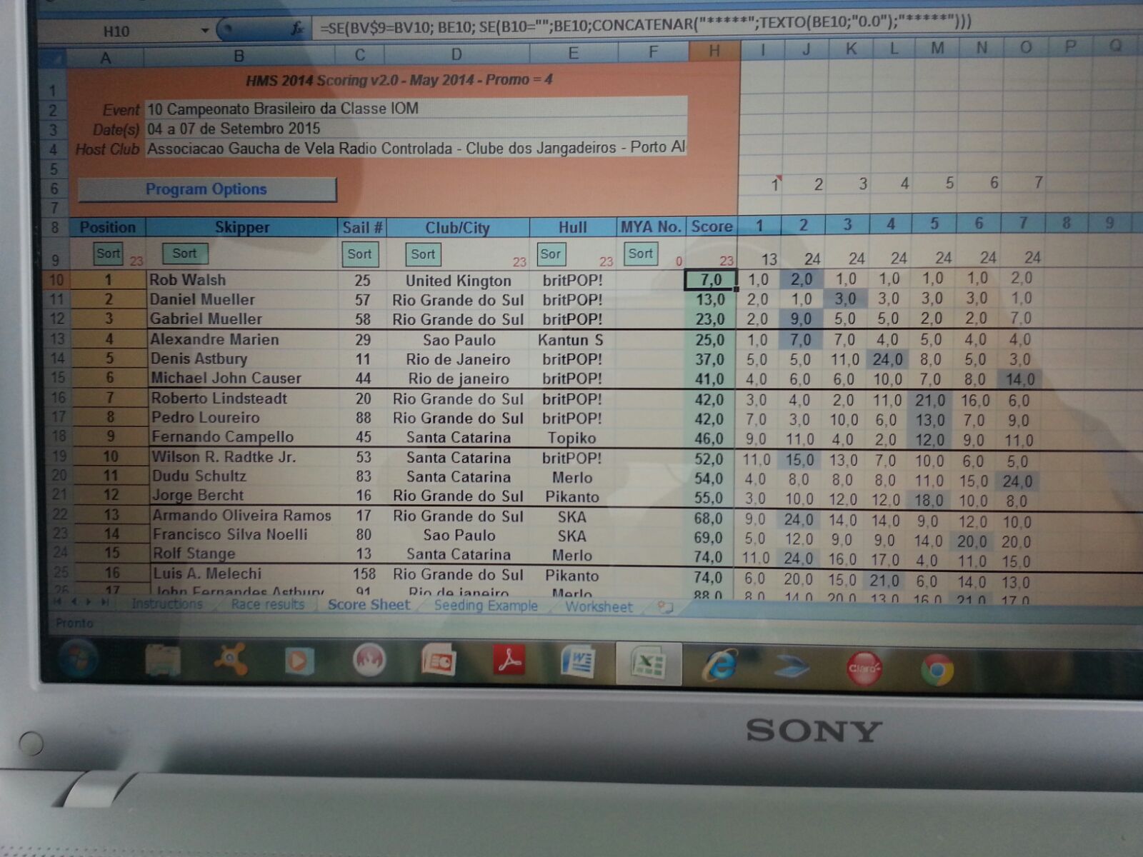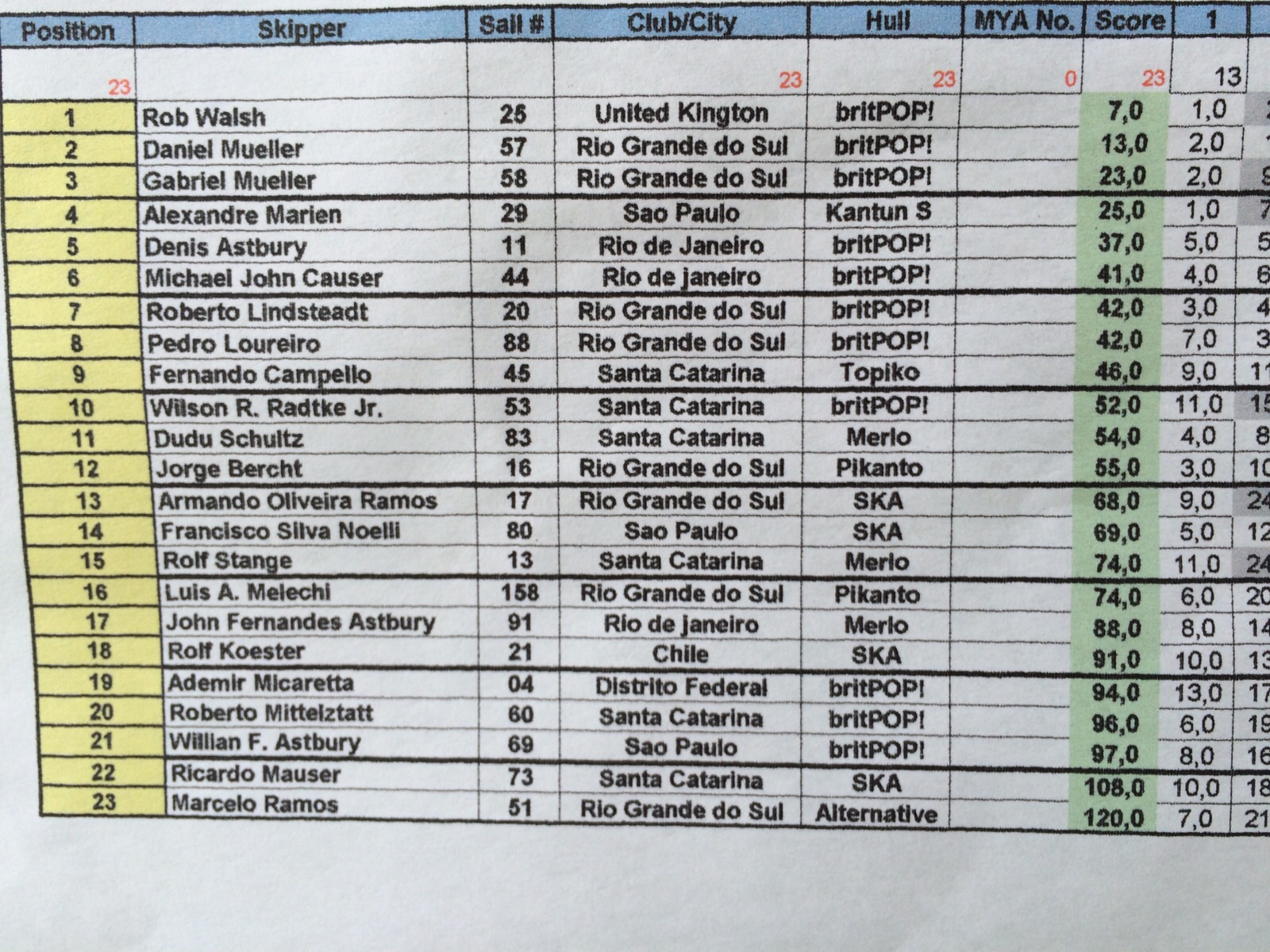 O campeonato iniciou no dia 05/09 com a presença de 23 barcos, foi dividido em duas flotilhas. Ontem sábado 06/09 foram corridas sete (7) regatas com ventos variando de 8 a 15 nós, cabendo aos velejadores a troca velas nas opções de a e b , foram várias trocas de vela durante o dia. Tempo bem frio, ao estilo inglês, com bons ventos. O campeonato está bem disputado, liderado por Rob Welsh (UK). A final do dia de ontem após regatas teve “churipão”e costelinhas de borco ( churrasco ).