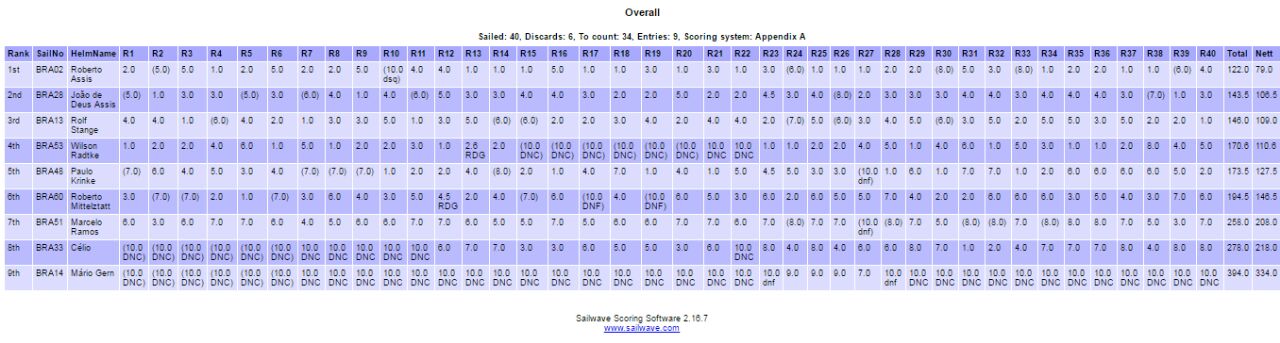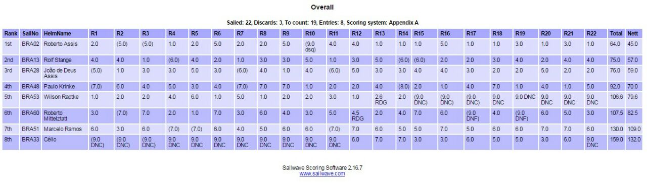 Ao final de duas etapas sagrou-se campeão o velejador Roberto Assis BRA 102 ( BG – Alternative), foi líder nas duas etapas, em segundo lugar João de Deus Assis BRA 28 ( BG – Alternative), em terceiro Rolf Stange BRA 13 ( BG – BritPop).