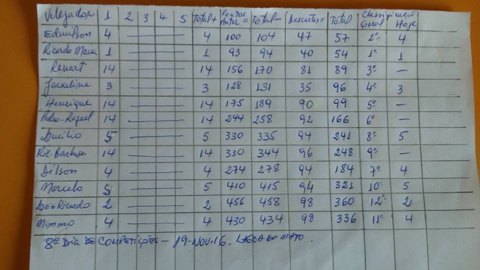 A animação prevaleceu mais uma vez no 8º dia de competições, tudo muito bonito, dia de sol, almoço delicioso, festejos do aniversário do Marcelo, regado a torta, esposas presentes, também nosso membro ilustre Socorro Leite, muita conversa boa, lamentamos somente a indisposição que tirou nossa juíza do cargo, mas bem substituída por Marcelo.