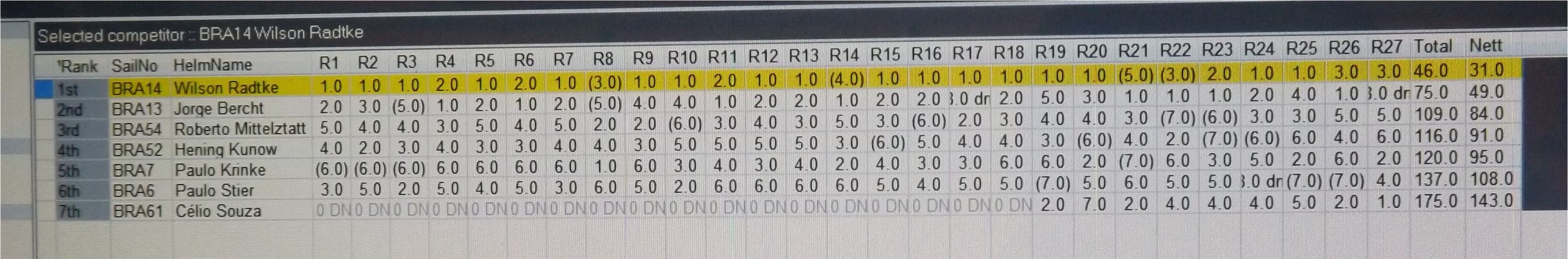 Segundo já iniciou um bom regime de vento até as 12:00 hrs quando paramos para um belo almoço, até então Wilson continuava como líder da primeira etapa. Reiniciamos as 13:00 hrs e não conseguimos dar uma largada sequer e assim até as 15:00 hrs. Ao final tivemos que nos retirar as pressas pois formava-se um temporal, que cooperou para não abrilhantar a entrega de medalhas. Final chegou com a realização de 27 regatas onde sagrou-se campeão sem contestação o velejador Wilson Radtke Jr. BRA 14…relembrado os bons tempos do Pedrinho….. Próxima etapa em 25 de novembro….