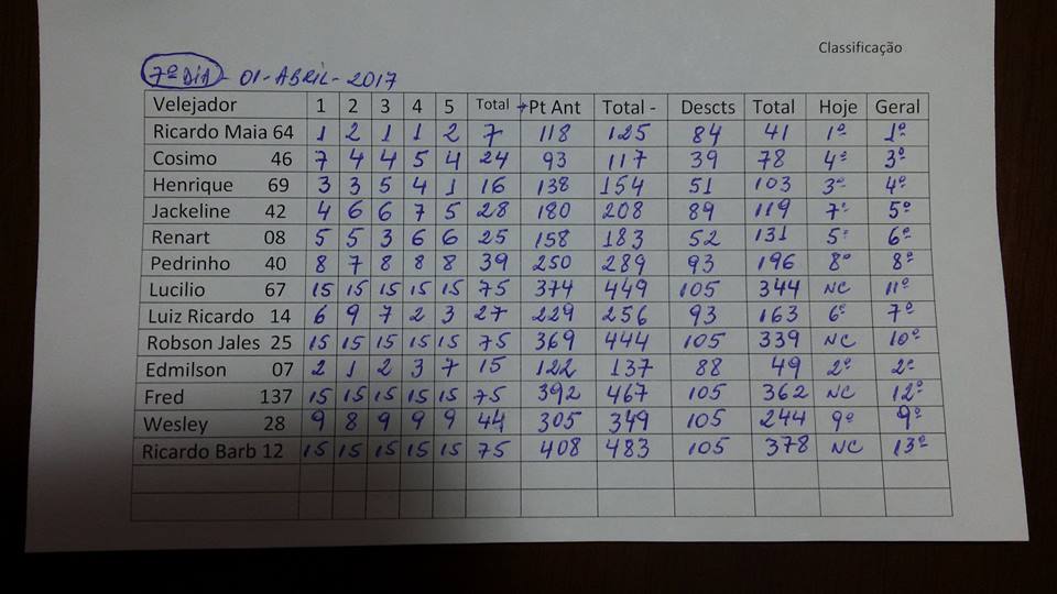 Nove bravos velejadores disputaram as cinco baterias com ventos rondados e de pouca intensidade, antes que a chuva chegasse com força derramando um pouco mais de água na raia que já estava bem cheia. Destaque para Luiz Ricardo que chegou em 2º e 3º nas últimas baterias. A ausência de nossa juíza foi sentida quando dos encontros e desencontros dos barcos e até mesmo quando um barco que cruzara a linha, quase atrapalhava um competidor na chegada, aliás, temos sentido falta de todos os nossos colegas que formam essa animada família do Nautimodelismo Natal. Contamos ainda com a presença ilustre de nossa querida Socorro com seu incomparável cafezinho.