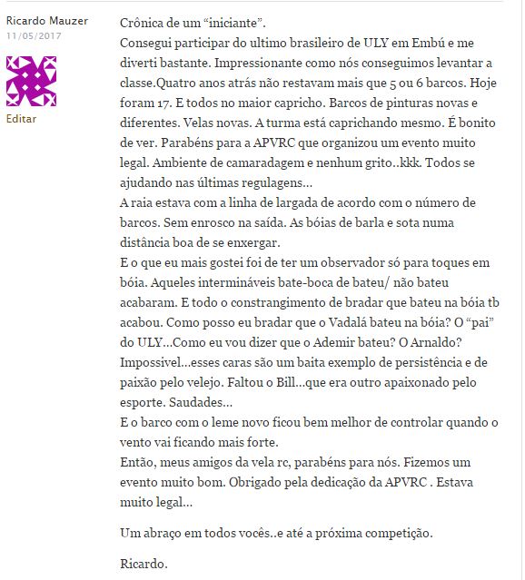 Ricardo Mauzer BRA 17, a vela rc brasileira agradece o seu reconhecimento, que agrega o otimismo de um futuro melhor para a classe 1Metro ULY brasileira/sul americana.