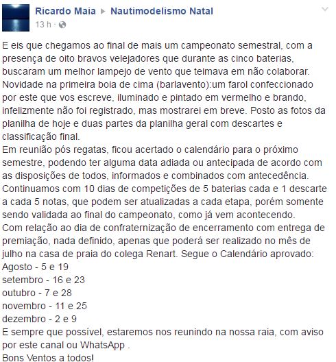 Gostaria de ressaltar o excelente desempenho da imbatível máquina, novamente ganhadora do Campeonato Potiguar do sementre. Um barco Skinny, projetado pelo saudoso e brilhante Pedro Stier, adaptado pelo Mestre Ademir Nicaretta e levado pelas velas do Mestre Paulo Stier. Com uma “conjunção” tão brilhante o resultado não poderia ser outro. Meus agradecimentos e meu respeito à estes líderes da Vela RC do RG65.