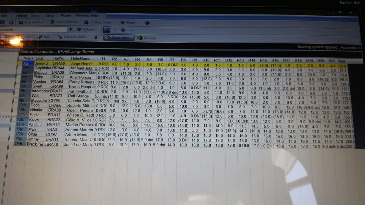 Após 4 dias de regatas sob as condições mais adversas, falta de vento, ventos fracos, ventos médios a fortes com rajadas e rondadas, chegando aos 20 nós, sagrou-se campeão o velejador Jorge Bercht – BRA 50.