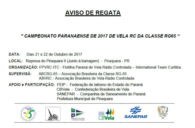 A FEIP – Federação de Iatismo do Estado do Paraná, SANEPAR – Companhia de Saneamento do Paraná e FPVRC – Flotilha Paraná de Vela RCFlotilha – ITC – International Team Curitiba, convidam a todos o velejadores a participarem de mais um evento estadual.