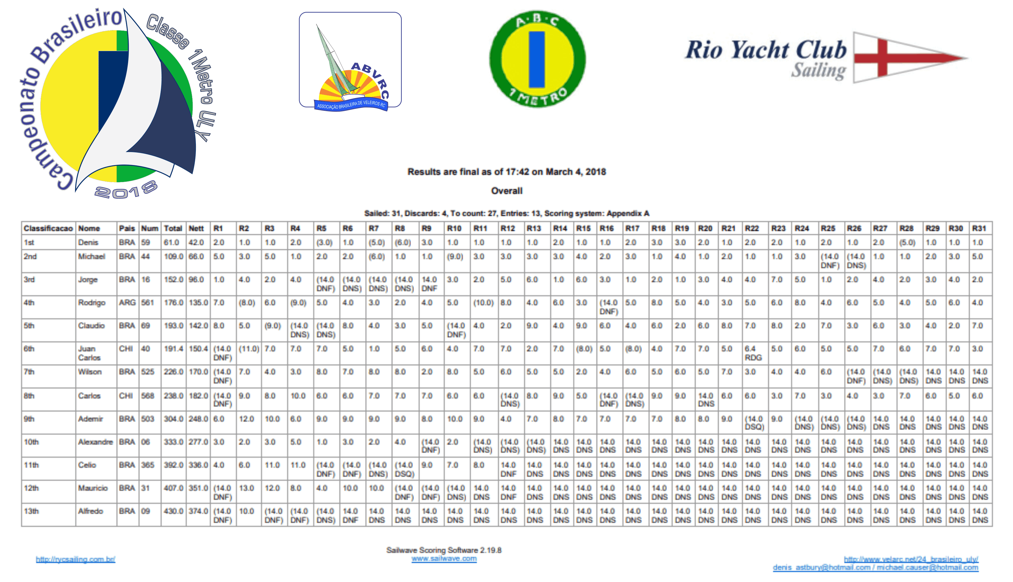 Denis Astbury velejando com maestria levantou mais um campeonato da classe 1Metro ULY, dois dias de bons ventos, de fracos em torno de dois nós e os fortes doze nós. Inscritos no evento 19 velejadores, dos quais 14 apresentaram-se para disputar o titulo nacional. No primeiro dia de evento houve quatro baixas por quebra e problemas de eletrônica (oxidação dos contatos eletrônicos). Notadamente a vibrante presença dos estrangeiros chilenos e argentinos que conduziram seus veleiros com destaque em todas as regatas, onde o destaque maior coube ao velejador argentino Rodrigo Fernandez ARG 561 pelo seu quarto lugar dentre os melhores brasileiros, o melhor colocado entre os estrangeiros. Mais um evento de grande sucesso de organização com atuação firme e objetiva do Gerente de Regatas Robert Wilton Swan e seus auxiliares Phillip Kemp Lekszycki e Clinio Marcelino de Freitas, este trio sob o comando de Robert durante todo o evento tinham sempre uma raia apontada para um contra vento perfeito. O vice-campeão Michael Causer BRA 44 velejou muito bem mostrando que está pronto para atingir o pódio máximo, Jorge Bercht BRA16 o campeão sul americano de 2017, um dos possíveis a brigar pelo primeiro lugar teve problemas no inicio do evento, o quinto lugar de Claudio Vaz BRA 69 é o resultado de sua participação em todos os eventos, dedicação, observação de erros e treinos orientados por seu guru Denis Astbury BRA 59. Outro destaque foi para o velejador chileno/cubano Juan Carlos CHI 40 pelo sexto lugar e o título de velejador “Fairplay”, merecidamente é um cavalheiro, o primeiro deste oferecido a um velejador estrangeiro. No início do evento bem como na entrega de prêmios tivemos a presença do Comodoro do Rio Yacth Club Saling Sr. Stefan Marceli Lekszycki, ao qual externamos nossos agradecimentos pelo apoio ao evento abrindo as portas do clube para vela rc e seus convidados, sob a coordenação de organização do velejador Michael John Causer BRA 44.