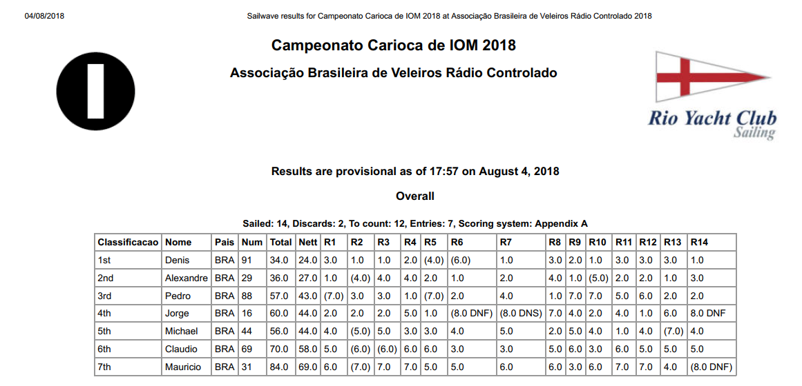 Resultado parcial do primeiro dia de evento, aponta como líder Denis Astbury, em segundo Alexandre Marien que vem travando uma luta pela liderança do certame. O evento conta com representantes do Rio de janeiro, São Paulo e Rio Grande do Sul. Notamos a ausência dos velejadores Arnaldo Faerman e Jayme Guerra.