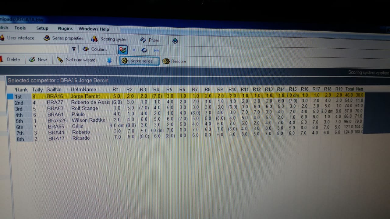 Neste fim de semana (18 e 19/08) após corridas 38 regatas, sagrou-se campeão catarinense em 2018 o velejador Jorge Bertch BRA 16, como vice campeão Rolf Stange BRA 53 e em terceiro Wilson Radtke Jr. BRA 525.