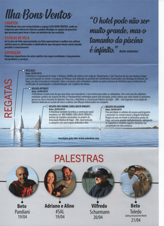 Neste sábado (16), na Marina Itajaí, a coordenação do evento esteve reunida para a definição de tarefas com relação a realização da Regata Vela Show em que estarão presentes no evento a vela Rádio controlada e diversas classes 1X1 que foram dividas em: 2 classes ( regata ou cruzeiro ) e quatro categorias: