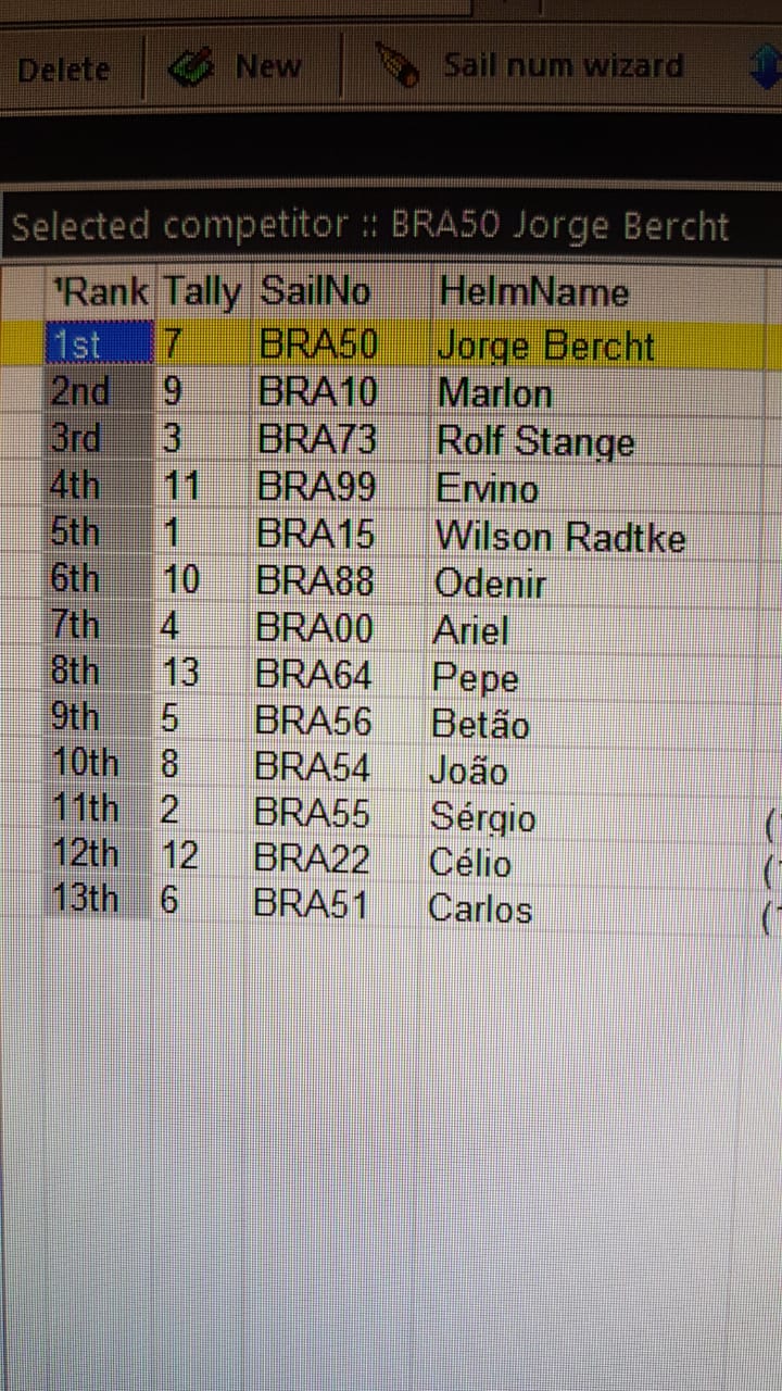 Dias antes do evento as previsões do tempo eram as piores, até mesmo para o dia do evento, chuva e tempo sem sol, mas todas as previsões falharam e logo pela manhã os bons ventos reinaram sobre a raia, raia montada ventos que chegavam aos 18 nós permitindo aos velejadores o uso de velas “C”, foi realizado ao longo do dia 25 regatas disputadíssimas, e assim foi o vento firme de noroeste durante todo dia brindado de muito sol. Diante deste quadro de bons ventos a supremacia dos veleiros bem aparelhados afinados e comandantes treinados, Jorge Bercht BRA 50 sagrou-se campeão desta edição, não menos importante o vice-campeonato de Marlon Preste BRA 10 e na terceira colocação Rolf Stange BRA 73, destaque para o velejador Oscar da Silva BRA 16 que atuou Juiz anotador e Célio Souza BRA22 como observador.
