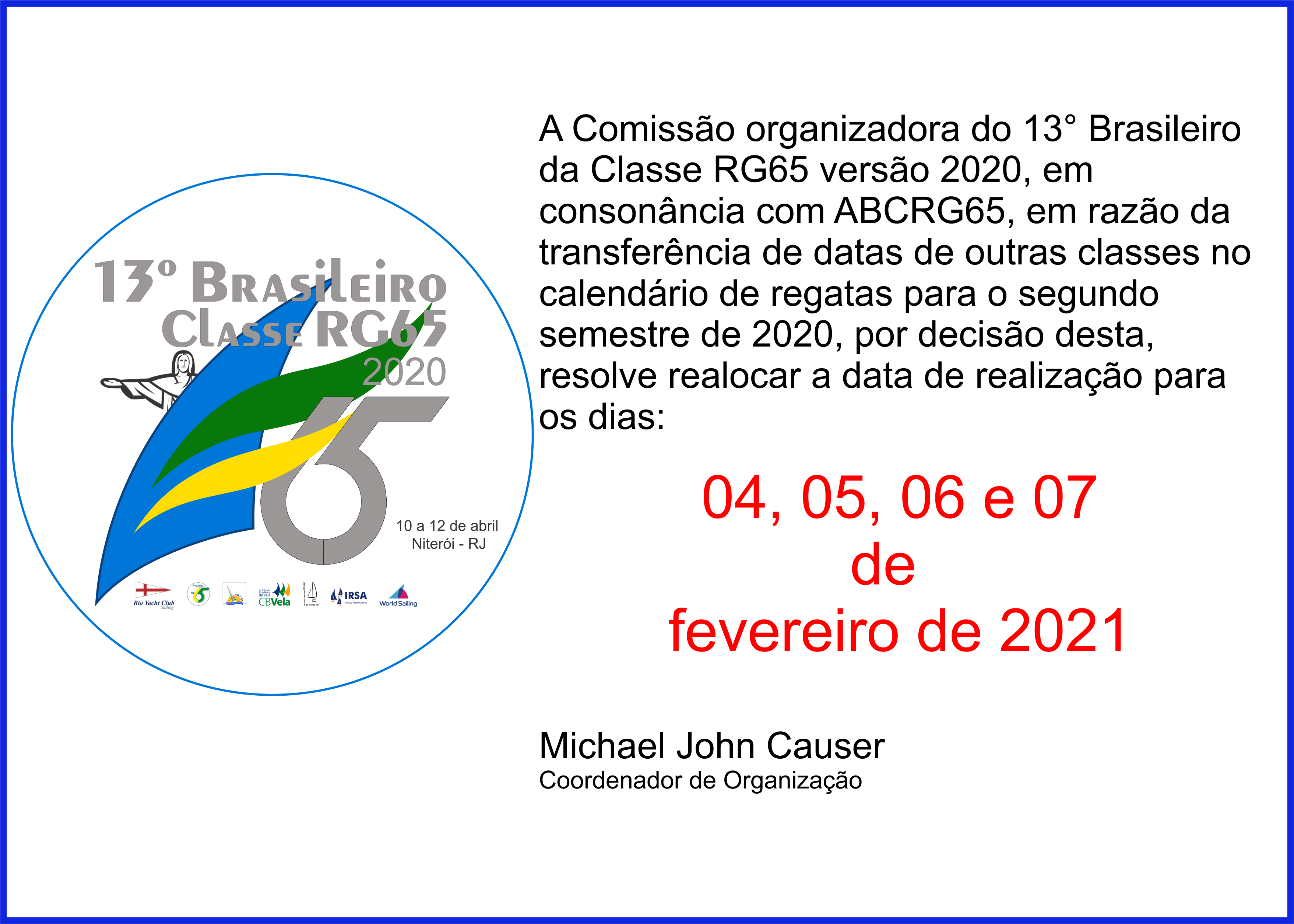 Amigo Javier, Debido a la pandemia de Covid19, estamos reubicando las fechas del evento, el coordinador de la clase en Brasil sabe que el evento se llevará a cabo en una fecha en la que todos los afiliados de ULY pueden participar, que de manera oportuna se informará a todos los marineros de la clase.
