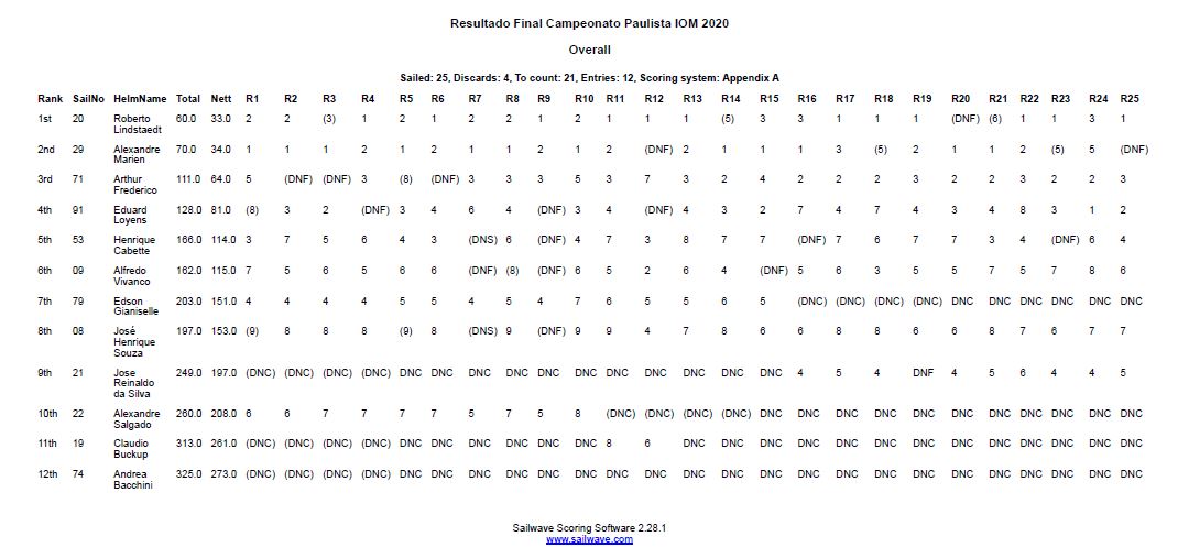 Durante dois dias 12 velejadores disputaram o maior evento paulista das classe, destaque especial aos velejadores, vindos da cidade vizinha de Piracicaba, José Henrique e José Reinado. A titulo de cortesia e reciprocidade a flotilha paulista está agendando uma regata da classe IOM em Piracicaba para promover a integração entre as flotilhas. Alexandre Salgado filiado a ANOCAVE, velejando um Elipses construído pela JD Boats, Alexandre está voltando ao esporte após alguns anos e já está planejando a participação no Campeonato Sul-Americano da classe que será realizado em novembro de 2021 no lago Rupanco na sede da Marina Rupanco.