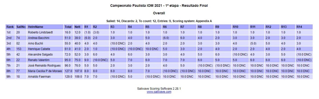 Aconteceu neste fim de semana em dois dias de regatas (15 e 16/05) a primeira etapa do Campeonato Paulista da classe 1 metro IOM nas dependências do Clube de Campo Castelo, contou com a presença de nove participantes, destaque para a presença feminina de Maria Cecilia – BRA 77. Foram dois dias intensos de regatas sob ventos fracos, ao final foram realizadas 14 regatas com o seguinte resultado parcial o qual deverá ser somado à segunda etapa: