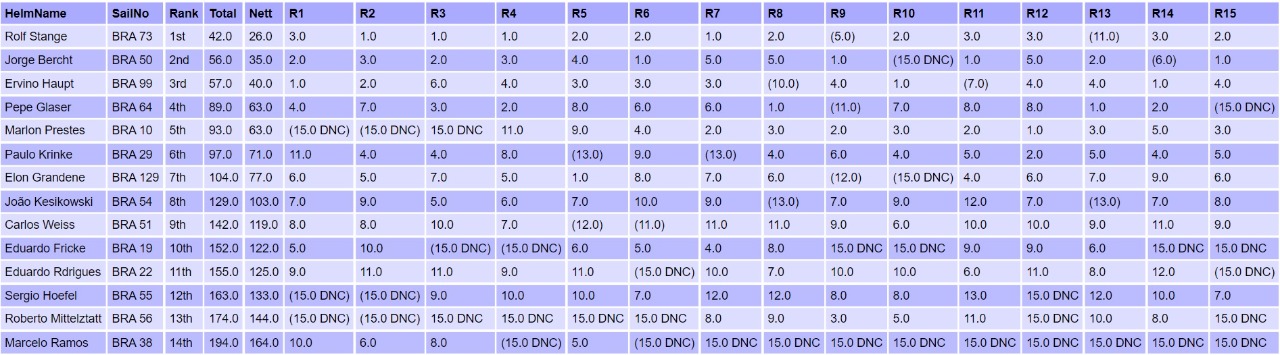 O grande campeão desta etapa foi o velejador Rolf Stange que representa o Clube de Modelismo Asas do Vale – CMAV em Gaspar, seguido por Jorge Bercht representa a Associação Gaúcha de Veleiro RC – AGVRC de Porto Alegre, em terceiro Ervino Haupt quer representa o International Team Curitiba de Curitiba.