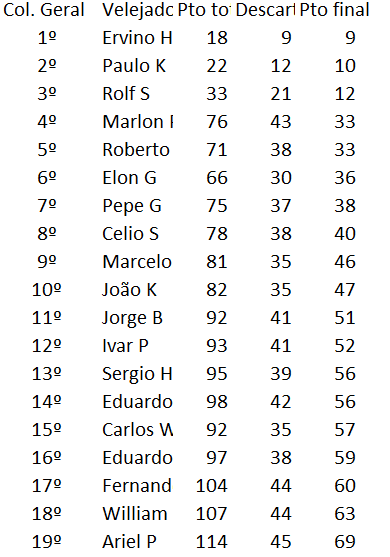 Ervino Haupt BRA 99 do Paraná foi grande campeão desta maratona de regatas, seguido pelos catarinenses Paulo Krinke BRA 29, segundo colocado e Rolf Stange BRA 73, terceiro colocado.