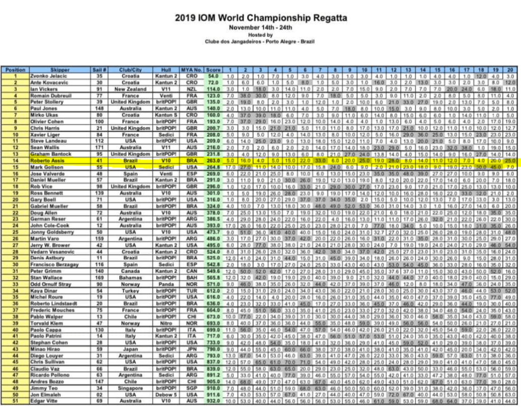 Ênfase aos resultados do vice campeão Jorge Bercht BRA 13 velejando seu velho veleiro Enigma de 35 anos de idade e do 3º colocado Roberto Mittelztat BRA 54 com o projeto do Frank Russell em 2019 Equation.