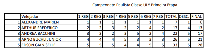 Em Embu das Artes em São Paulo no lago do Parque Francisco Rizzo, recebeu os velejadores das 1Metro ULY para a primeira etapa do Campeonato Paulista de ULY, foram corridas 7 regatas sob regime de ventos moderados.