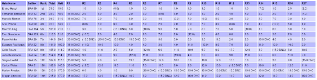 Um sábado cinza, frio para padrões dos visitantes, de pouco ou nenhum vento na primeira regata, após esta realizada fomos ao lanche à espera do vento, passados 30 minutos os participantes foram chamados as regatas, pois o vento timidamente aumentava, reinou durante toda tarde, bem rodado, propiciando regatas de auto nível e bem disputadas. Não podemos negar a supremacia do velejador Ervino BRA99 que liderou as regatas da Copa Inverno desde a primeira regata. Seguido Por Fernando BRA13 se manteve entre os três primeiros colocados, velejou muito bem, uma performance brilhante diante dos oponentes que lá estavam. Em terceiro Marcelo BRA78, outra grande velejada colocando seu vermelhinho entre os primeiros colocados.