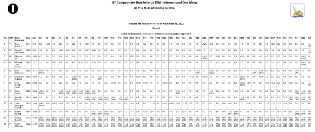 O Campeonato Brasileiro de Vela Rádio Controlada – Classe IOM aconteceu no final de semana de 12 a 15 de novembro em raia montada a frente da sede do Clube dos Oficiais Bombeiros do Rio de Janeiro na lagoa de Marapendi – Barra da Tijuca no Rio de Janeiro; Este evento marcou a volta ao clube sede após algum tempo sem atividades da modalidade, totalizou 13 inscritos, presentes 11 participantes representando os estados do RJ, SP, PR e SC.