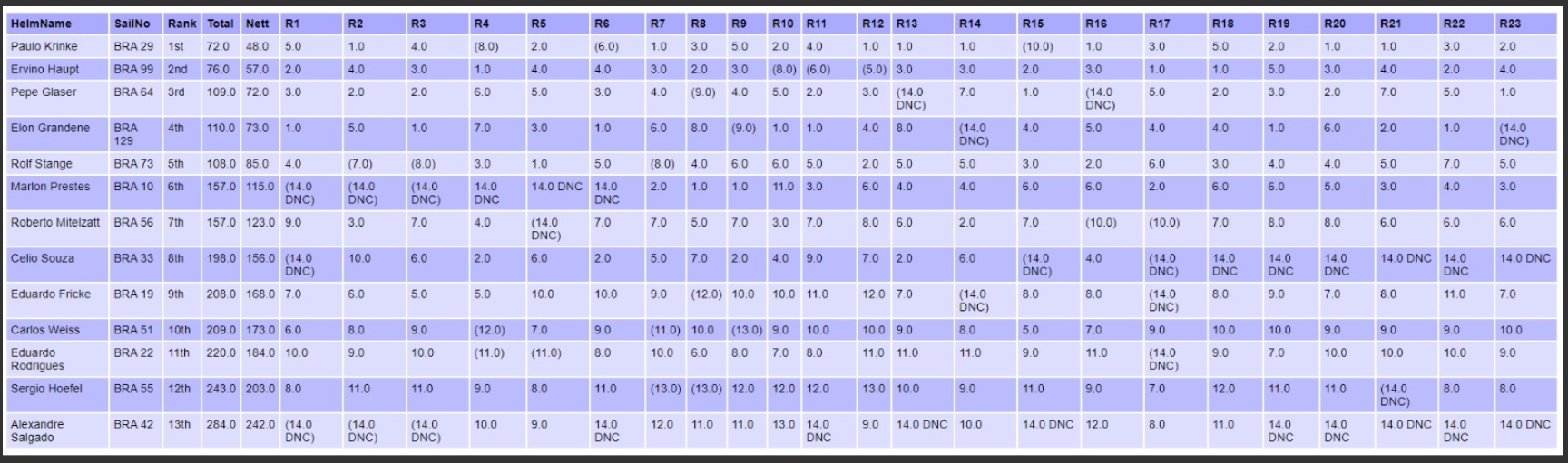 O velejador Paulo Krinke, do barco BRA 29, sagrou-se campeão do Campeonato Paraná Santa Catarina de RG65 após a realização de 23 regatas. O evento, que teve início às 10:00 horas e terminou às 16:30, contou com ventos constantes do quadrante sudeste durante a manhã, que viraram para leste no período da tarde.