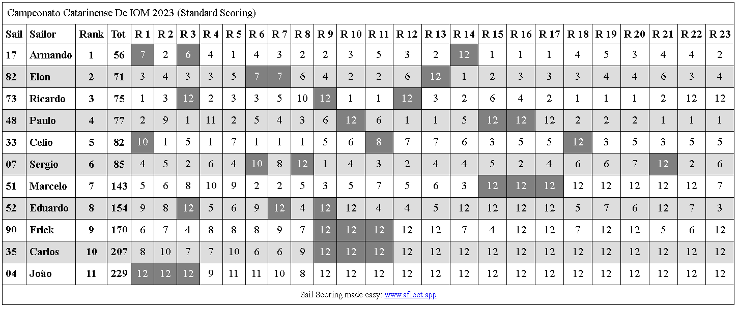 Após a realização de 23 regatas intensas, o gaúcho Armando Ramos BRA11, representante da Associação Gaúcha de Veleiros RC, sagrou-se campeão. Em segundo lugar, outro gaúcho representando Santa Catarina, Elon Grandene BRA82, e em terceiro lugar, mais um gaúcho representando Santa Catarina, Ricardo Mauzer BRA73.