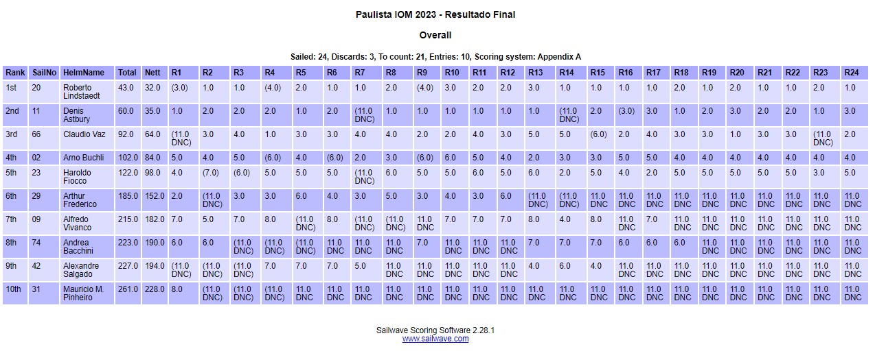 Após um total de 24 regatas, em terceiro lugar ficou o velejador carioca Cláudio Vaz, em segundo lugar também representando o RJ o velejador Denis Astbury e o campeão do Paulista 2023 da classe IOM foi o velejador da APVRC, Roberto Lindstaedt.
