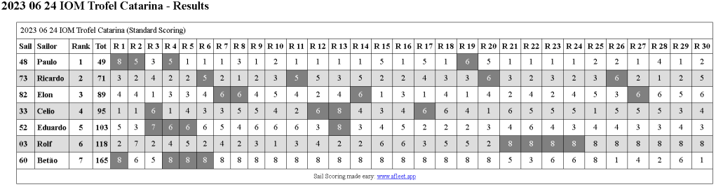 Durante dois dias intensos de regatas, a flotilha de Santa Catarina se reuniu em um evento para testar novos barcos e equipamentos. Ao longo de 30 regatas, os velejadores enfrentaram ventos variáveis, com intensidades que oscilaram entre 3 nós e rajadas de até 10 nós. Ao final do evento, o velejador Paulo Krinke, representando o BRA 48, sagrou-se campeão, seguido por Ricardo Mauzer, do BRA 73, na segunda posição, e Elon Grendene em terceiro lugar.