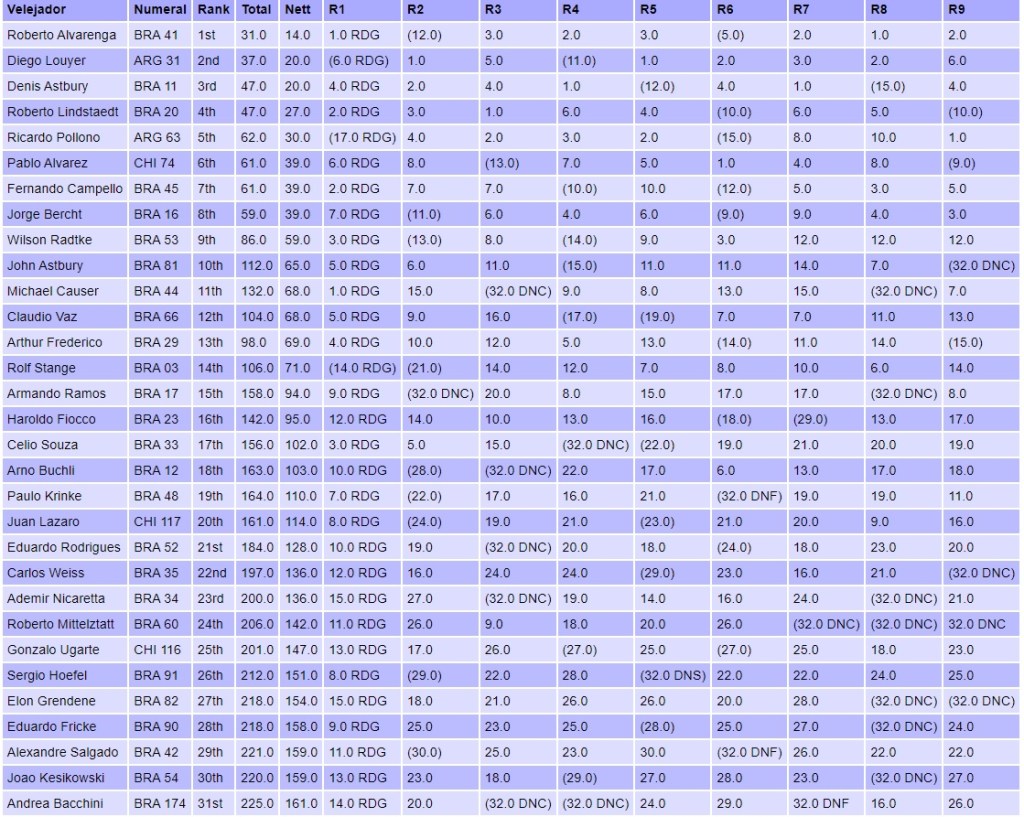 Após intensas disputas ao longo de 9 regatas, o velejador brasileiro Roberto Alvarenga Assis BRA 41, sagrou-se campeão do 17º Campeonato Brasileiro de Veleiros Rádio Controlados – Classe IOM. Em segundo lugar, ficou o velejador argentino Diego Louyer ARG 31, seguido pelo brasileiro Denis Astbury BRA 11, em terceiro lugar. Destaque também para Fernando Campelo, do BRA 45, que competiu em alto nível mesmo com o seu barco, o Topiko, estando parado no estaleiro por mais de 10 anos. Aos 78 anos de idade, Ademir Maturino Nicaretta, representando pelo BRA 34, também mereceu destaque por sua dedicação à vela rc.