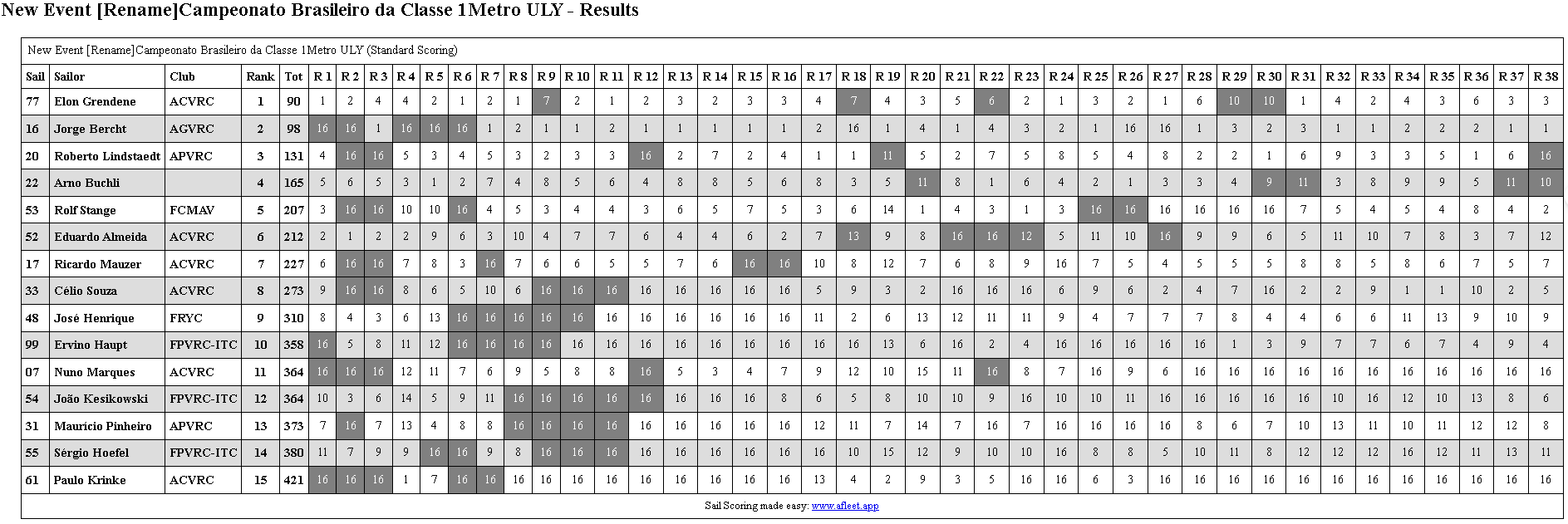 O grande título de campeão ficou nas mãos do destemido velejador brasileiro, Elon Grendene, com a braçadeira BRA77. Que feito incrível, hein? Mas o pódio não para por aí, não. Em segundo lugar, temos Jorge Bercht, BRA16, e em terceiro, Roberto Lindstaedt, BRA20. Esses caras mandaram ver e mostraram que são os verdadeiros mestres das velas!