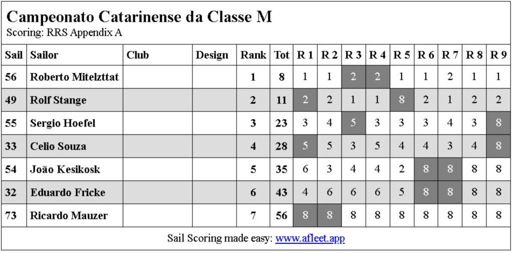 Roberto Mittelztatt BRA 56 é o novo campeão catarinense, em segundo Rolf Stange BRA 49, em terceiro Sergio Hoefel BRA 55.