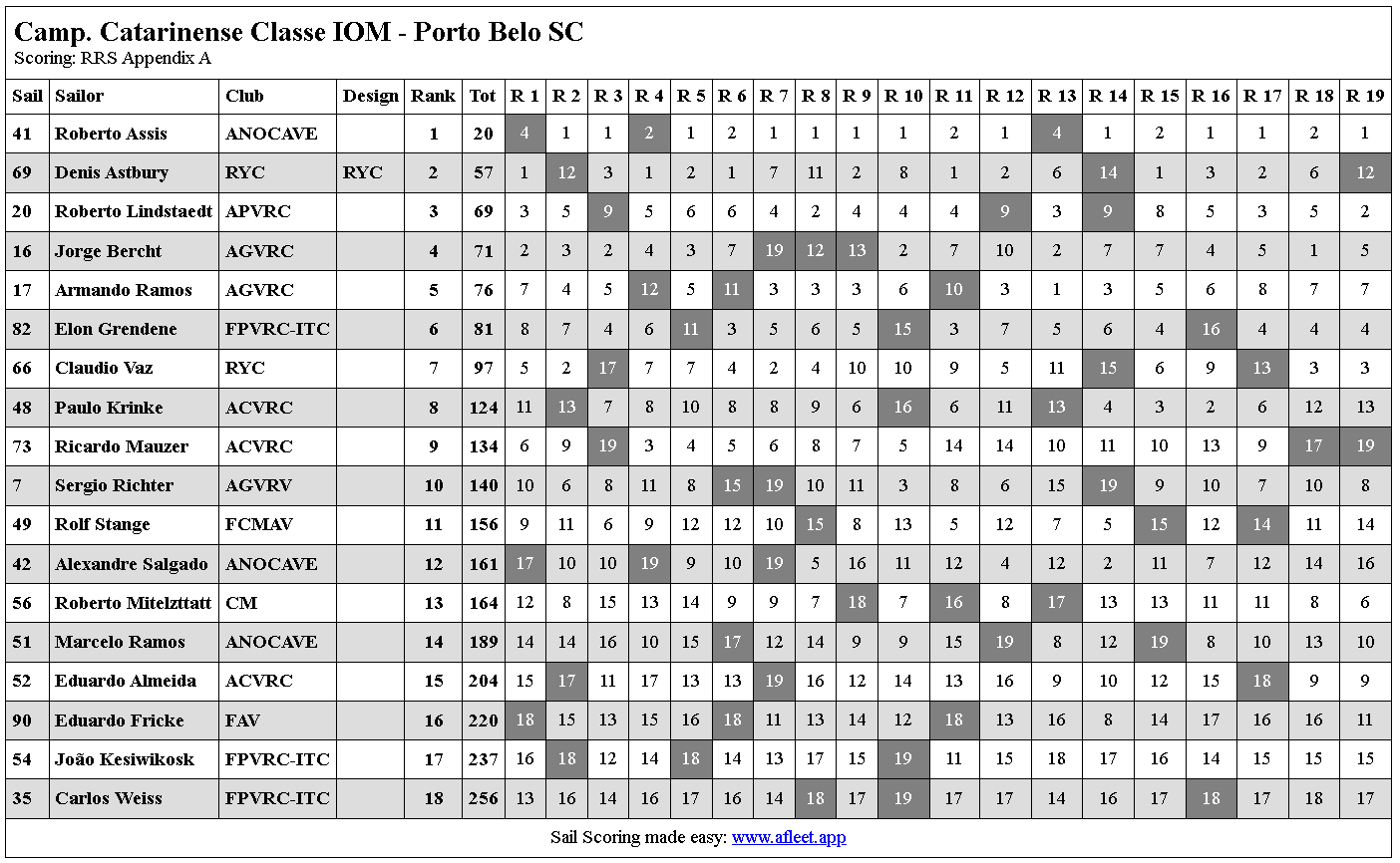 Com representantes de cidades como Porto Alegre (RS), Santo Amaro da Imperatriz (SC), Florianópolis (SC), Bombinhas (SC), Balneário Camboriú (SC), Navegantes (SC), Blumenau (SC), Joinville (SC), Curitiba (PR), São Paulo (SP) e Rio de Janeiro (RJ), o campeonato trouxe para a raia catarinense velejadores experientes, muitos deles já confirmados no 19º Campeonato Brasileiro da Classe IOM, que também será realizado em Porto Belo, no próximo mês de agosto.