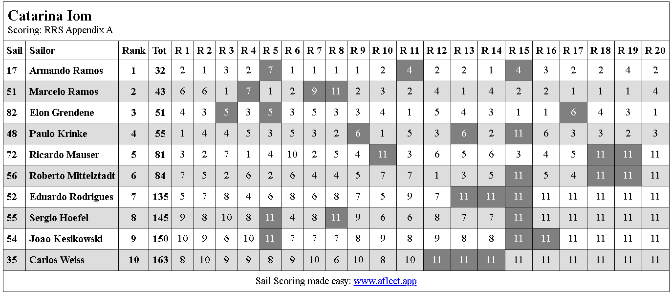 Ao final da tarde, com a saída gradual dos competidores, restaram apenas quatro velejadores na água: Armando, Marcelo, Elon e Paulo Krinke. Após as últimas baterias, foi realizada a premiação aos três primeiros colocados: