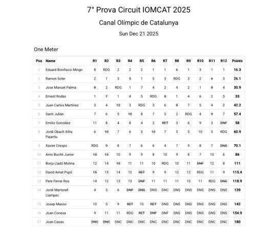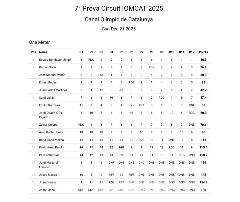 No dia 21 de dezembro de 2025 foi disputada a última etapa do Circuito Catalunya, realizada no Canal Olímpico de Barcelona. Para a utilização da área de regatas, cada competidor paga uma taxa de € 16,00, enquanto o acesso do público custa € 4,00. Esta etapa contou com a participação de 17 velejadores.